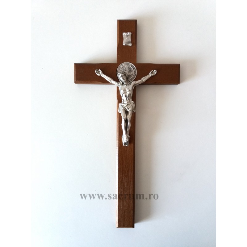 Cruce din lemn cu corpus din metal si medalia Sf. Benedict diametru 3 cm
