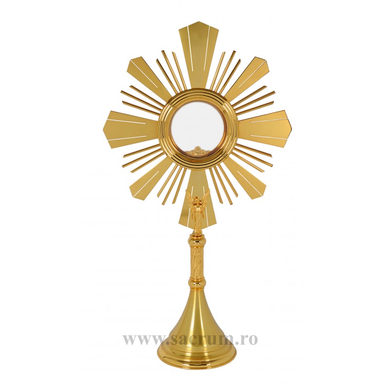 Monstranta pentru Adoratia Euharistica cu decoruri argintate, lucrat manual Inaltime 52 cm, diametru 31 cm. Se potriveste pentru ostiile noastre
