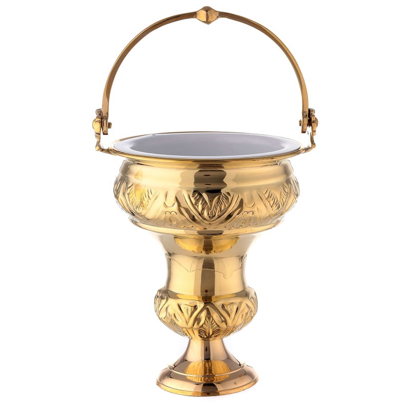 Galetusa pentru apa sfintita are  inaltime 30 cm, decorata cu doua desene in stil baroc in relief