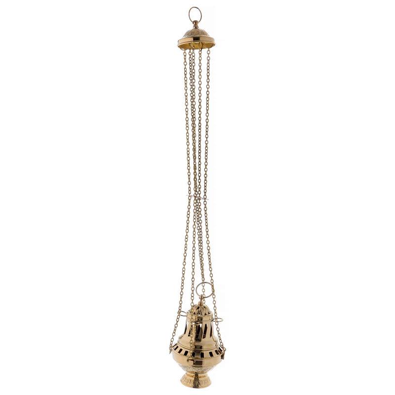 Cadelnita din alama aurita, inaltime 14 cm Diametru: 8 cm Lungime lant: 84 cm
