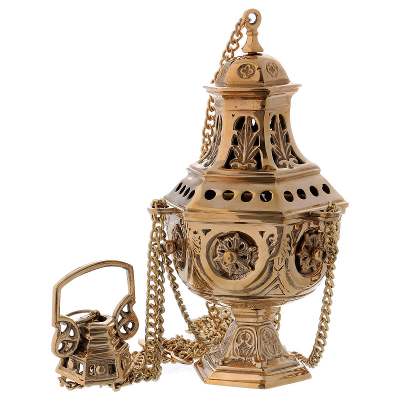 Cadelnita din alama aurita, inaltime 10 cm Diametru: 6 cm Lungime lant: 40 cm