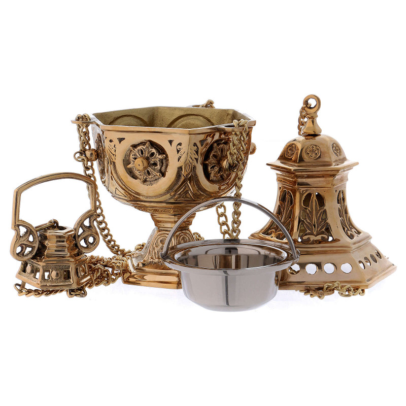 Navicela (suport pentru tamaie) din alama aurita, lucrata manual si lingurita inclusa Inaltime 15 cm