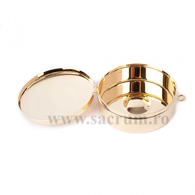 Cutie pentru ostii, din alama aurita, iar capacul decorat cu simboluri liturgice Dimensiuni: 5.4 x 1.5 cm