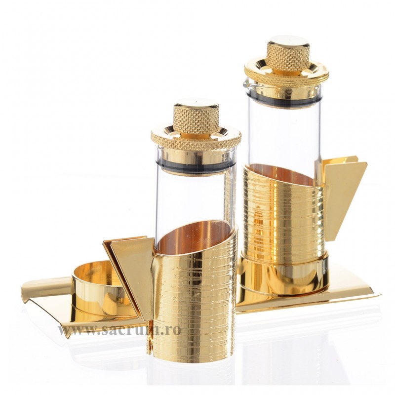Paharute Liturgice pe tavita din metal aurit. Cele doua paharute se fixeaza de tavita cu manerul fiecaruia, astfel se evita