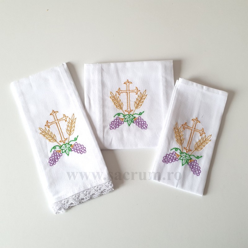 Set pentru potir brodat: – purificator  – 46 x 38 cm – corporal – 38 x 38 cm – manutergiu