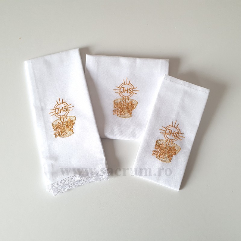 Set pentru potir brodat: – purificator  – 46 x 38 cm – corporal – 38 x 38 cm – manutergiu