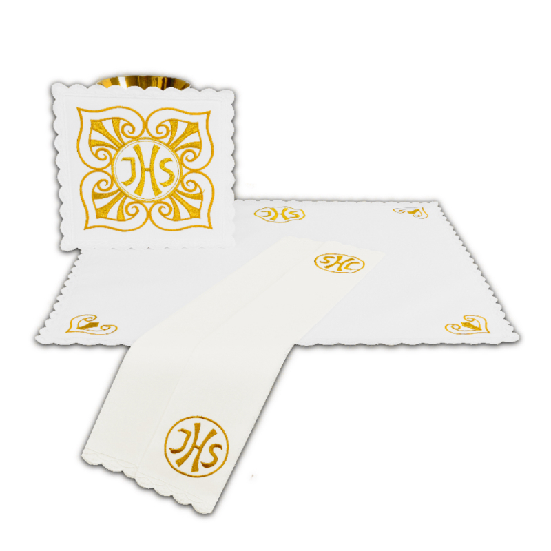 Set pentru potir brodat: – purificator  – 46 x 38 cm – corporal – 38 x 38 cm – manutergiu