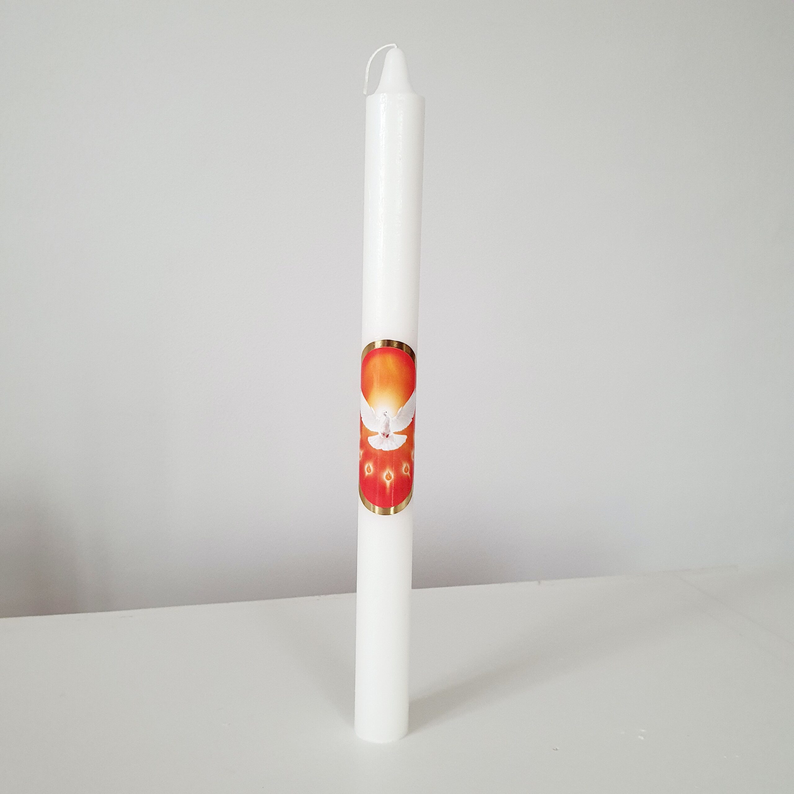 Lumanare din ceara pentru Mir sau pentru altar cu simboluri ale Duhului Sfant Dimensiuni: inaltime 25 cm, diametru 7 cm Va rugam
