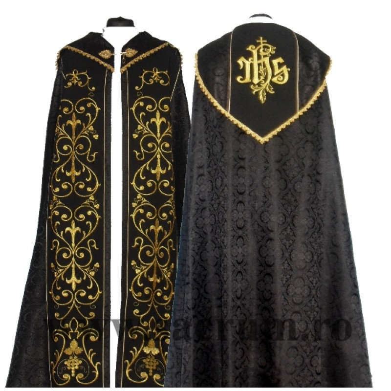 Pluvial negru brodat atat pe guler cat si in fata cu fir auriu. Material brocart, stola inclusa