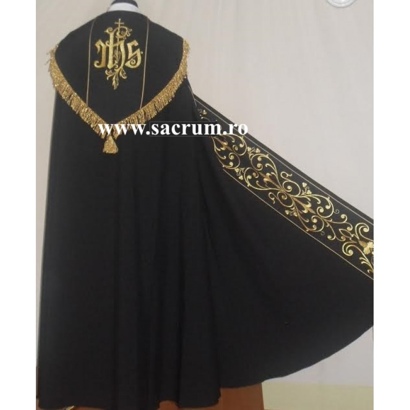 Pluvial negru brodat atat pe guler cat sin fata cu fir auriu. Stola inclusa